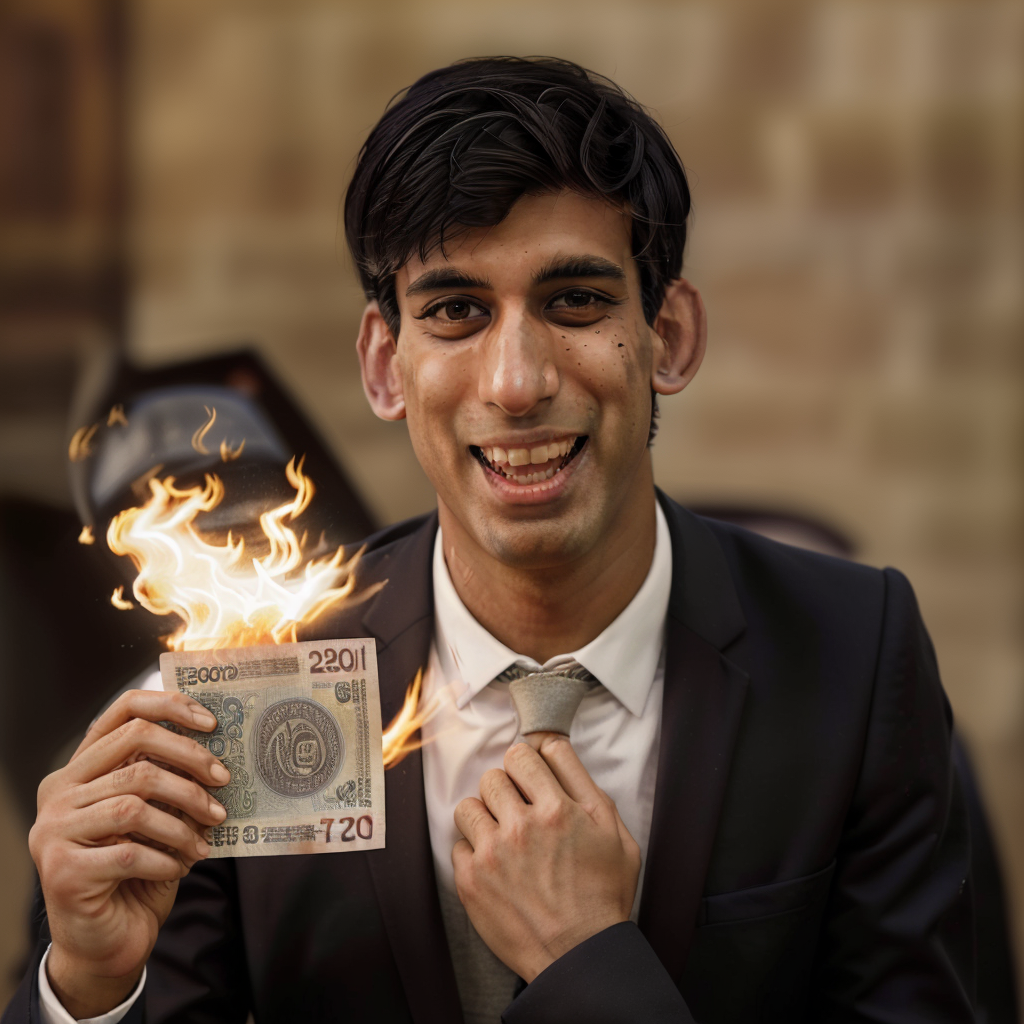 <lora:rshsnk:1> gleeful rishi sunak rshsnk holding a burning british banknote