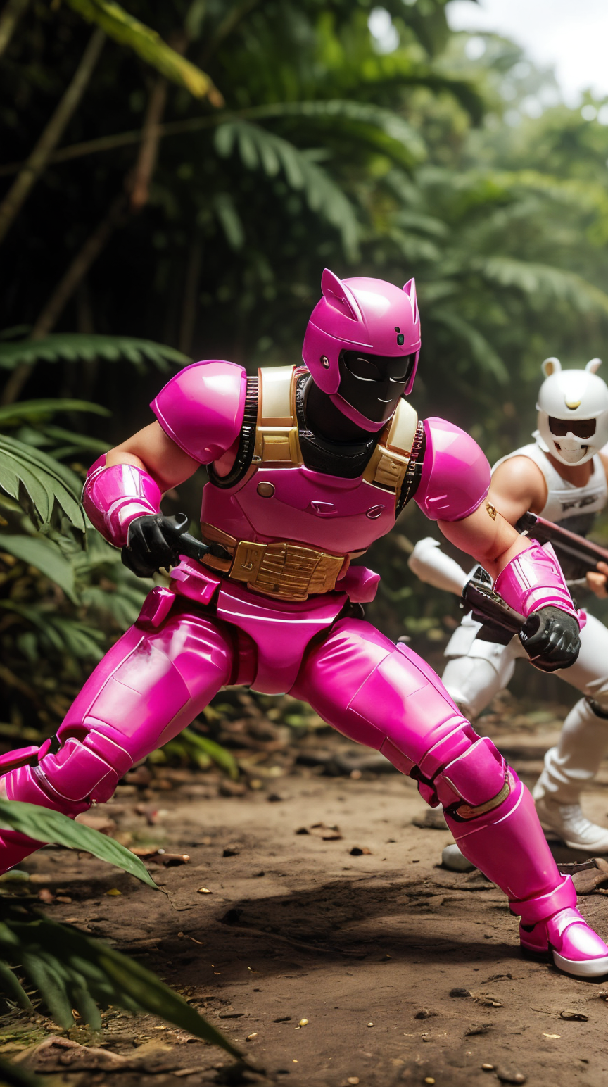 Pink colored <lora:BarbieCore:0.9> BarbieCore pirates ambushed by masked thieves in a perilous rainforest duel, (shiny plastic:0.8), (pink plastic:0.9), (masterpiece:1.3) RAW photo