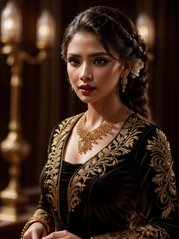 detailed clothing, intricate clothing, beautiful Super Detailed, Best Quality, Professional Lighting, Cinematic Lighting, beautiful dramatic lighting, shallow depth of field, physics-based rendering, 8k, Bokeh, highest quality, ultra high resolution, professional, 4k, highly detailed, photography, woman, portrait of java wedding woman in black long kebaya dress traditional, red lipstick, golden necklace, earrings, ornate, detail, flowers, high detail eyes, high detail hair, Cinematic lighting, epic lighting,<lora:ARWJavaWeddingWoman:1> <lora:LoRa_epiCRealismHelper:1> <lora:add_detail:1>