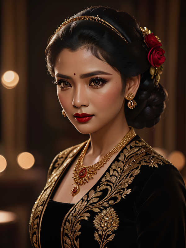 view from front, ((center rule of thirds )), soft light detailed clothing, intricate clothing, beautiful Super Detailed, Best Quality, Professional Lighting, Cinematic Lighting, beautiful dramatic lighting, shallow depth of field, physics-based rendering, 8k, Bokeh, highest quality, ultra high resolution, professional, 4k, highly detailed, photography, woman, portrait of java wedding woman in black long kebaya dress traditional, red lipstick, golden necklace, earrings, ornate, detail, flowers, high detail eyes, high detail hair, Cinematic lighting, epic lighting,<lora:ARWJavaWeddingWoman:1> <lora:LoRa_epiCRealismHelper:1> <lora:add_detail:-1>