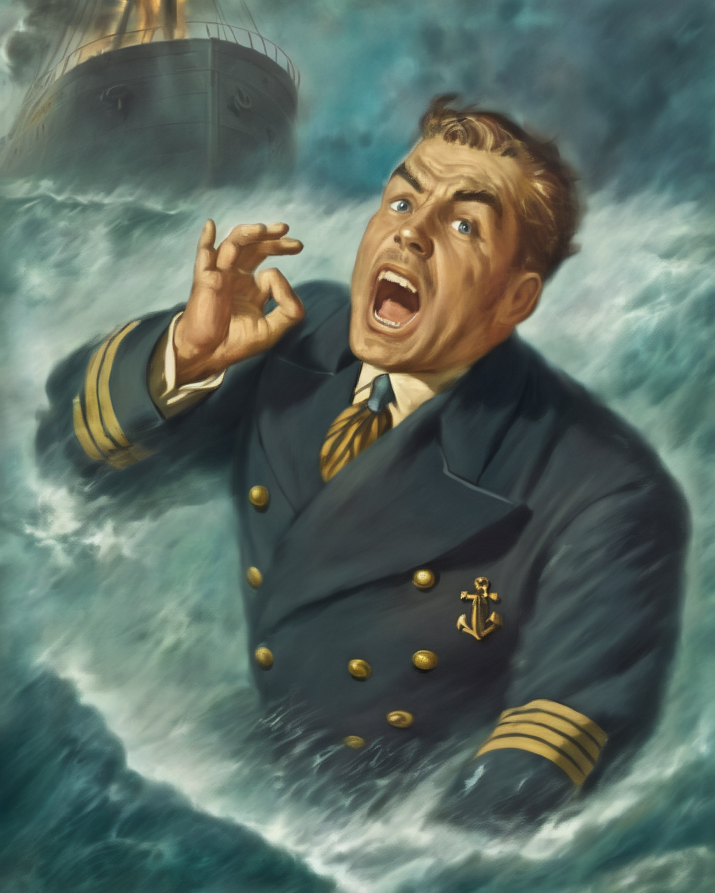 A male captain, solo, portrait, close-up,drowning in the ocean, body is under water, screaming desperately, one hand up, Storm, shipwreck, (Fire on the ship:0.2), thunderstorm, looking up, vintage_p_style, <lora:VintagePPXL:1>