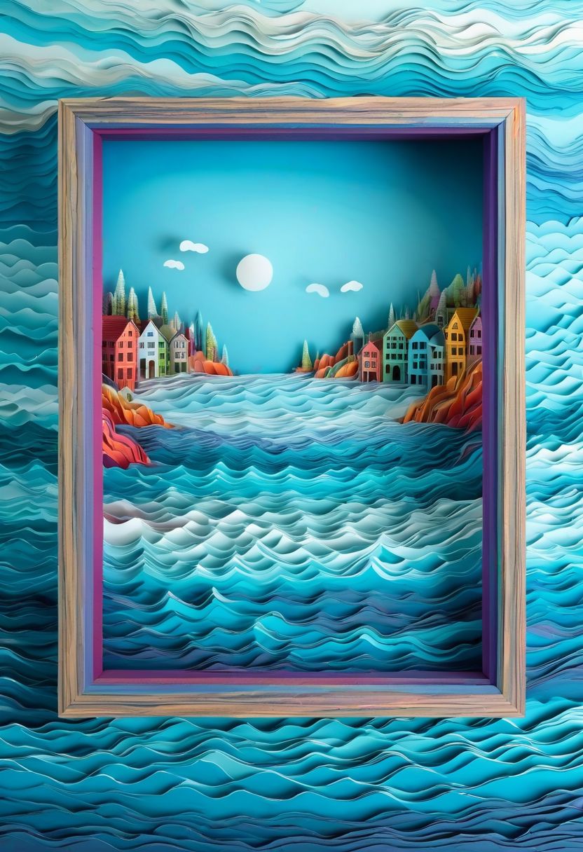 (3d Frame, seascape) ghost town, multi-colored volumetric fog made of crazy marbled paper