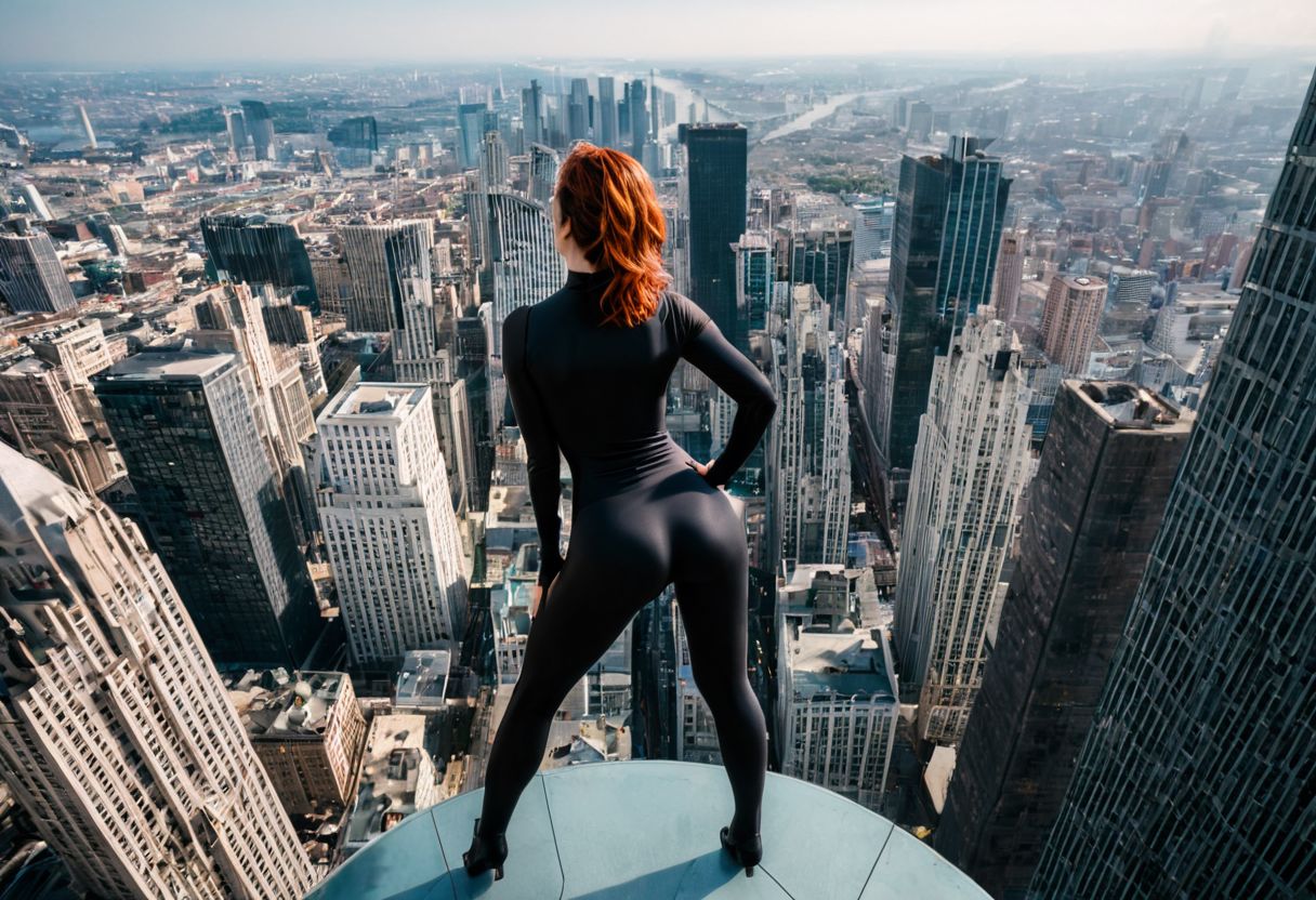 Woman wearing a tight costume, standing on the top of a skyscraper, looking over a city