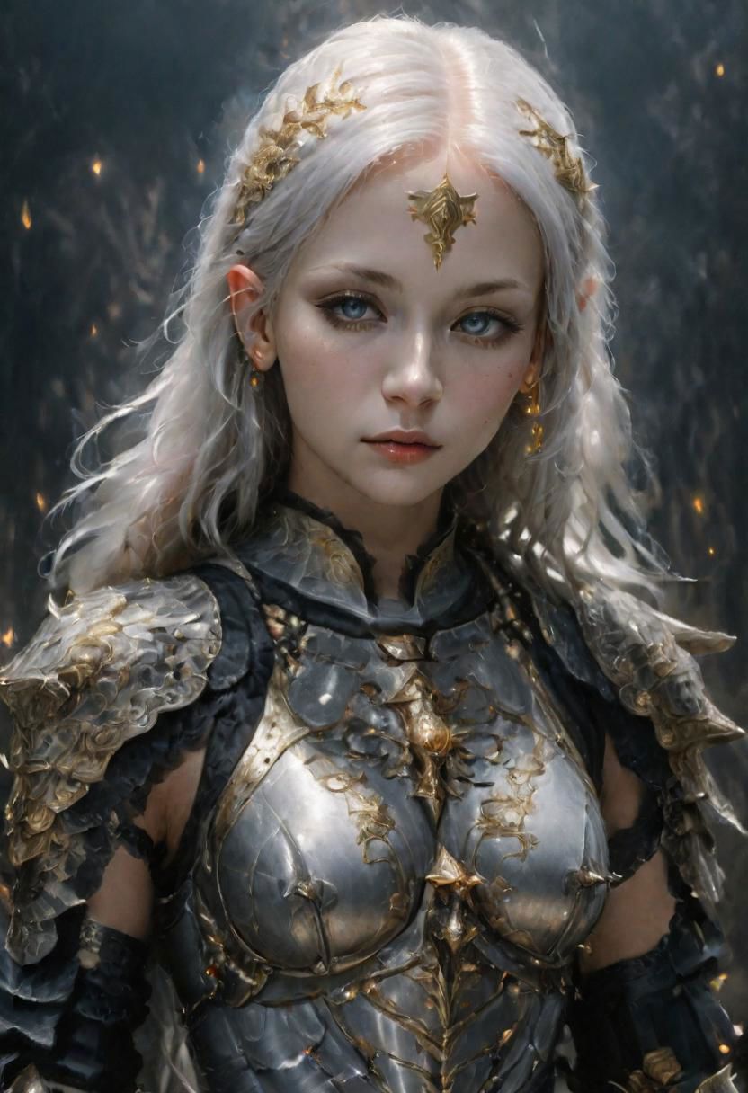 analog film photograph of the high queen, an elf female of unearthly beauty, very long straight white hair, very pale pink skin, light grey eyes, (natural ears:1.2) mysterious smirking expression, looking down at the viewer, wearing (intricately decorated Milanese black (full cuirass) plate armor:1.4), intricately decorated with a damask, gold inlay, (brandishing a glowing sword pointed at the viewer:1.9), elf queen, full body shot, 1girl, GLOWING STYLE