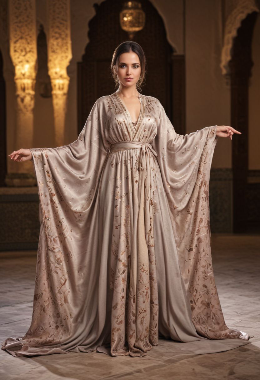 Hijab, woman, brunette, lift up silk caftan traditionnel, open legs, full body shot, fantasy quality, moroccan style, open shirt style dress, haute couture, luxury, fashion design elegant, beautiful cinematic lighting colors pictures, 8k uhd quality, maximum detailed, photorealism, professional photo movement, complex background