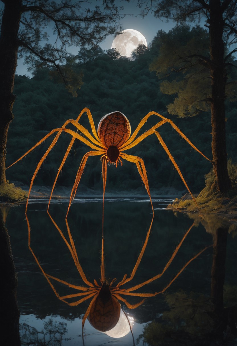 translucent spider monster, looming by a river, solo, outdoors, water, from behind, tree, night, moon, nature, scenery, forest, reflection, dark, ripples, lake, absurdres, masterpiece, 8k, high detail, intricate, best quality, mystical creature, many legs, thin spindly legs, highly detailed, award-winning, cinematic still shot, Kodachrome, uhd, canon eos