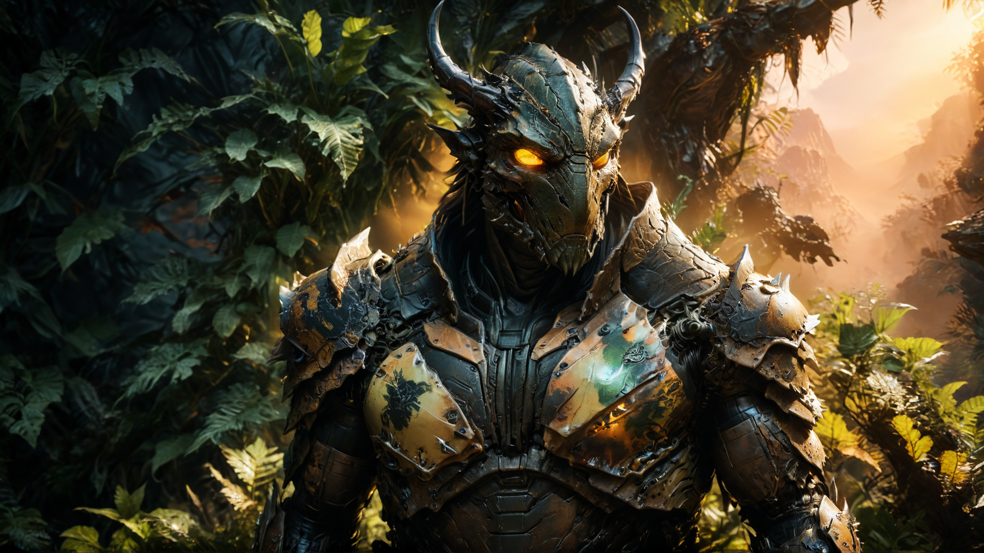 a sleek camouflaged dragonborn, cowboy shot, in an alien jungle at sunset, caustic rim lighting, hard shadows, dimly glowing mechanical eyes, low contrast, <lora:aesthetic_anime_v1s:1> <lora:add-detail-xl:2> <lora:xl_more_art-full_v1:0.9>