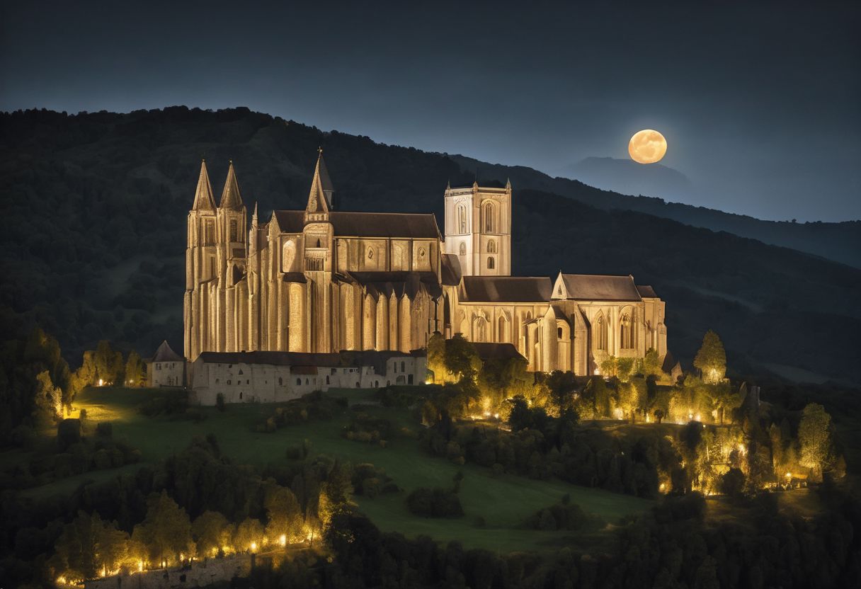 ((masterpiece, best quality)),(complex light), The image represents an abbey on top of a mountain, it is night, in the abbey you can see windows from which light comes out, on the side of the mountain there are figures of monks walking in a row with their backs to the viewer, the moon is can see from the top of the abbey and illuminates the image with its light