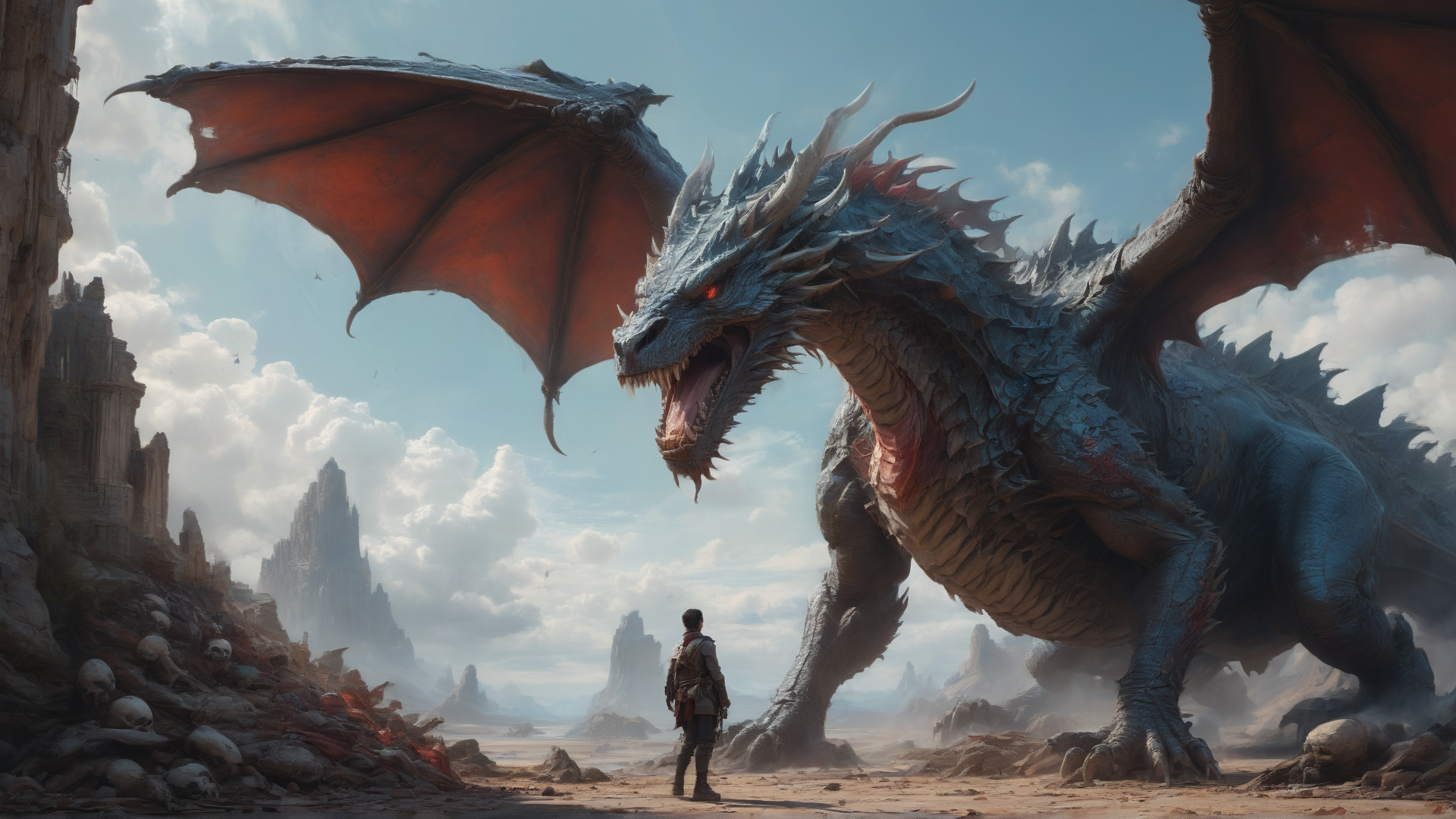 two people are standing under a dragon watching other skulls, in the style of concept art, light sky-blue and dark crimson, dynamic action scenes, ashcan school, precisionism influence, realistic depictions of human form, gigantic scale <lora:aesthetic_anime_v1s:1>