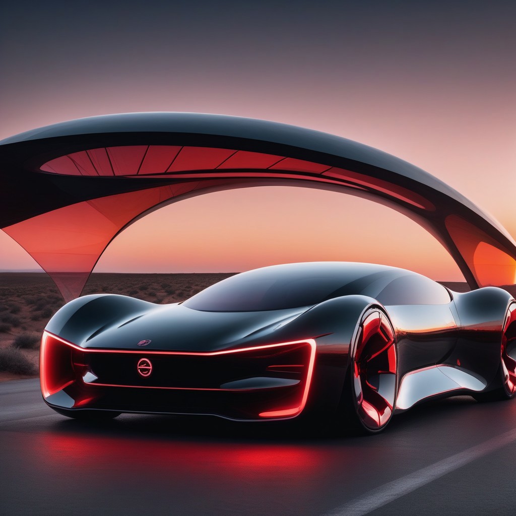 Futuristic concept car at sunrise, metal flared skeleton walls, sustainable design, black and light red gradient, organically shaped body, electric, clear edges<lora:HTTP_20231128195717-000006:1>