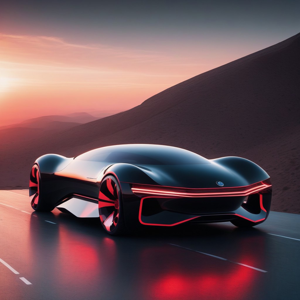 Futuristic concept car at sunrise, metal flared skeleton walls, sustainable design, black and light red gradient, organically shaped body, electric, clear edges<lora:HTTP_20231128195717-000006:1>