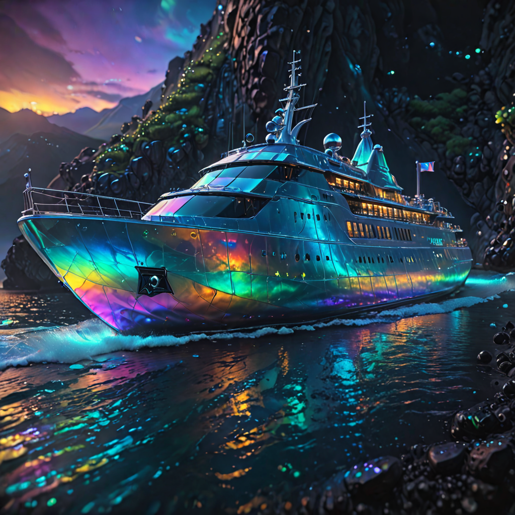 A iridescent ship in the ocean,near mountains,a white beach nearby,bioluminescent water,night time photography,HDR,4K HD image,octane render,unreal engine,volumetric lighting,artstation,cgsociety,artstationHD,behance,highly detailed,hyperrealistic,octane rendering,8k,high contrast,golden ratio,cinematic,awe inspiring,award winning,trending on DeviantArt,<lora:IOS_Iridescent_opal_style:1>,
