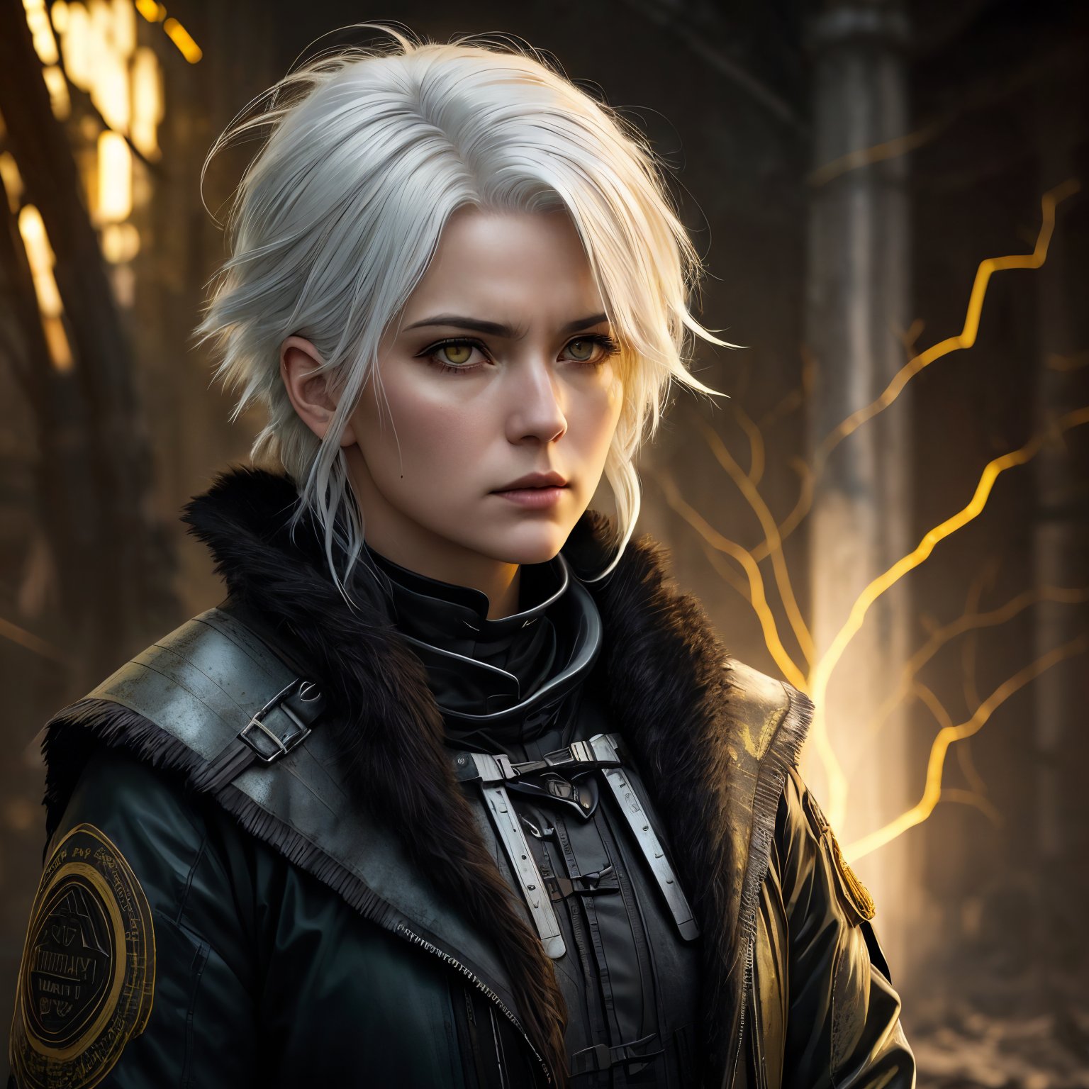Raw digital photo, Digital art, majestic, Boorish, Kintsugi Weary Basque Mentat, White hair styled as Ivy League, ultrafine detailed, Post-Apocalyptic, dramatic lighting, Cold Colors, DayGlo yellow explosions