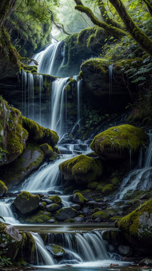 Photography, Serene Waterfalls, Capturing the serenity and beauty of cascading waterfalls in a lush forest, Surrounded by moss-covered rocks and greenery, Emphasizing cool and refreshing tones, Detailing the textures of flowing water and surrounding foliage, Utilizing natural sunlight to create soft, diffused light and shadows, Composing a tranquil scene with the waterfalls as the focal point, Interacting with wildlife and flowing into serene pools, In the style of Ansel Adams, <lora:add_detail:1> <lora:add_saturation:0.6> <lora:add_sharpness:1>