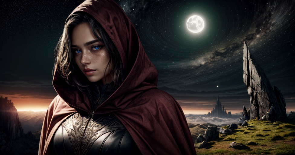 A mysterious figure, wrapped in a cloak adorned with intricate celestial patterns, stands gracefully on the edge of an ancient stone platform, under the soft glow of a distant moon, with the vastness of an alien landscape stretching behind them. Captured from a low angle, with a wide-aperture lens, the enigmatic persona exudes an aura of otherworldly power, reminiscent of the style of Annie Leibovitz, <lora:add_detail:1> <lora:add_saturation:1> <lora:add_sharpness:1>