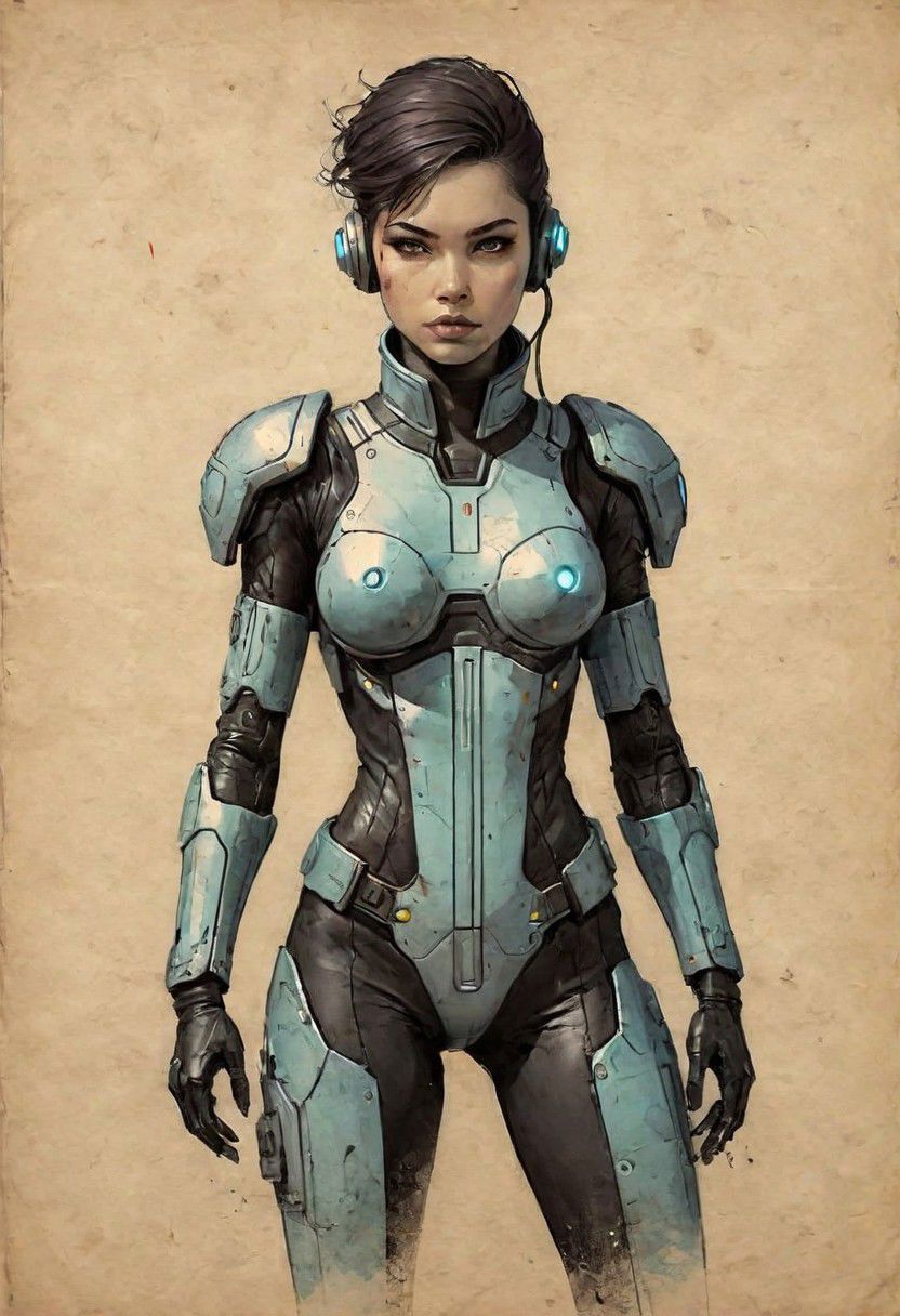old book style ink illustration, on parchment, ink splashes, ink stains, ink smears, faded ink, (female enforcer:1.5), (futuristic:1.5), distant future, female pilot controls giant robot to protect the city from alien invaders, gloomy tones,mentixis, linquivera