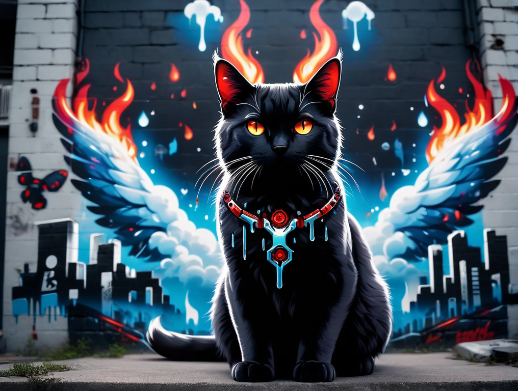 cinematic photo black, blue, cat, clouds, colorful, dripping, flames, graffiti, mural, grey cat, horns, red, robotic, silver, space, white, wings . 35mm photograph, film, bokeh, professional, 4k, highly detailed<lora:Harrlogos_v2.0:1.0>