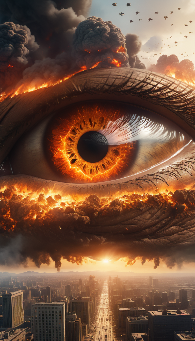 8k dlsr photo A cinematic, hyperrealistic, extreme high-detail giant human eye with the scene of nuclear explosion inside, trending on ArtStation, by Jordan Grimmer and DBLX, in the style of Greg Rutkowski and Artgerm. The image is intricate and painstakingly detailed, with a huge epic war scene inside the eye.