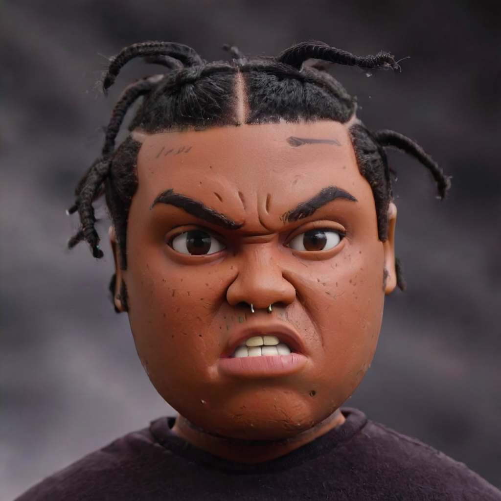 <lora:Clay Animation:1> clay, animation, claymation <lora:mkybrxl:1> mkybr, male focus, 1boy, dark-skinned male, small braids sticking out on head, photo background fat black man