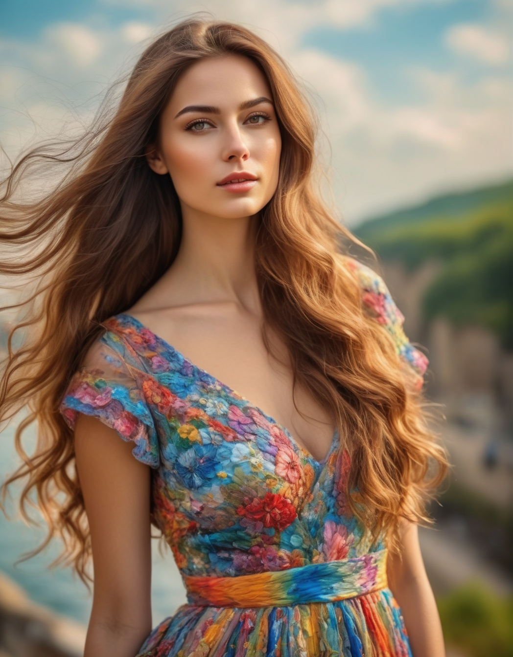 8k dlsr photo A cinematic, hyperrealistic, extreme high-detail Woman, beautiful impressionist dress, very deatil beautiful multicolor long hair,