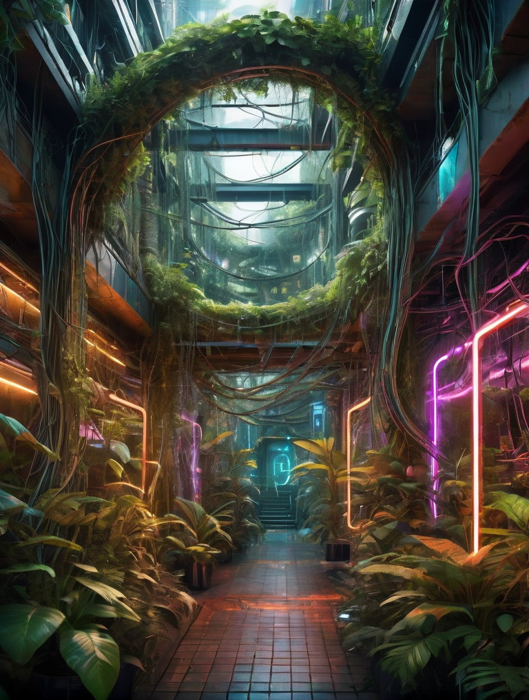 Hyperrealistic art Create a picture of an electronic jungle where swirling circuits and neon vines create cyber ecosystems where connectivity is the key to survival,high quality,highres,masterpiece, . Extremely high-resolution details, photographic, realism pushed to extreme, fine texture, incredibly lifelike
