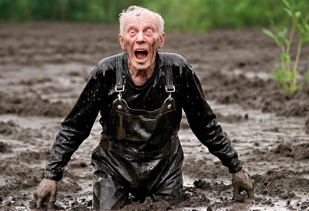 an 80 year old man with a grotesque appearance, wearing dirty black rubber overalls, stuck chest deep in black mud, screaming, struggling, splattered, raining, soaked, helpless, despair, fear, quicksand, peril, dramatic