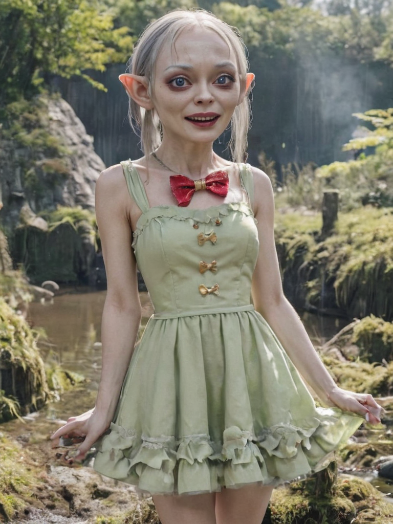 modeling photo gollum wearing colorful idol dress, bow, (((makeup))), red ((lipstick)), (((eyeshadow))), (eyeliner:1.6), penciled eyebrows, necklace, kawaii, cute pose, swamp background <lora:gollum v1a:0.6> <lora:xl_idol_dress-2.0:0.6>