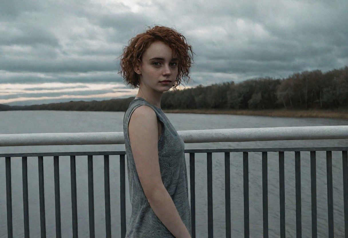 attractive young woman standing alone by the railing, desolate embankment, river behind her, dark grey sky, solo, messy frizzy bob cut hair, detailed pretty face, portrait photo, (short plain basic minimal clubwear bodycon mini-dress), (((detailed pretty face))), pale delicate body, petite, ((low lighting)), raw photo, amateur grainy phone photo, portrait photo, accidental art, (cinematic lighting), (cinematic scene), cinematic grain filter, (poor lighting conditions), lo-fi photo, low contrast, alt girl, e-girl, (edgy night club outfit), nsfw, dark cyberpunk