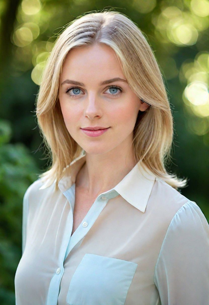 portrait of a s0phia_n0texist with fair complexion and straight, shoulder-length blonde hair, lighting is soft and natural, gentle glow on her face, subtle bokeh effect in the background, pale pink skin tone with freackles, pale blue eyes, looking the camera with neutral expression. Wears a semi-transparent white blouse, light airy feel. Natural outdoor background, muted colors, warm tones palette of her skin and the soft whites of her blouse, juxtaposed against the cooler greens and natural browns of the background. gentle and organic, with the soft roundness of her face, the straight lines of her hair, blurred background, contemplative