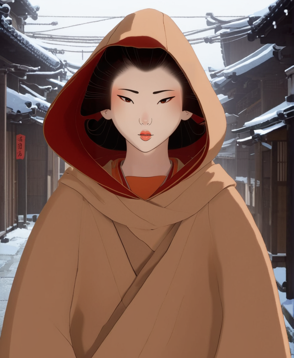 full color drawing of Akemi,cloak,hood up,looking down,in a brown shiromuku, empty street, Edo period, upper body, epic character composition,by ilya kuvshinov, manon bailly, drawing <lora:BlueEyeSamurai:1>