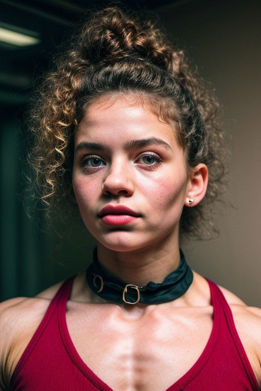 raw photo, a cute afraid girl, female bodybuilder, curly brown hair, tied to bun, 20 years old, curl mascara, glitter eyeliner, buff, choker, realistic skin texture, red dress, (Army Green:0.8), hardcore, cold lighting, morbid atmosphere, instagram style, fashion (ramen shop:1.1), (sfw:0.9), highly detailed photography, (muted colors, cinematic, dim colors, soothing tones:1.2), vibrant, insanely detailed, hyperdetailed, (dark shot:1.2), (vsco:0.3)