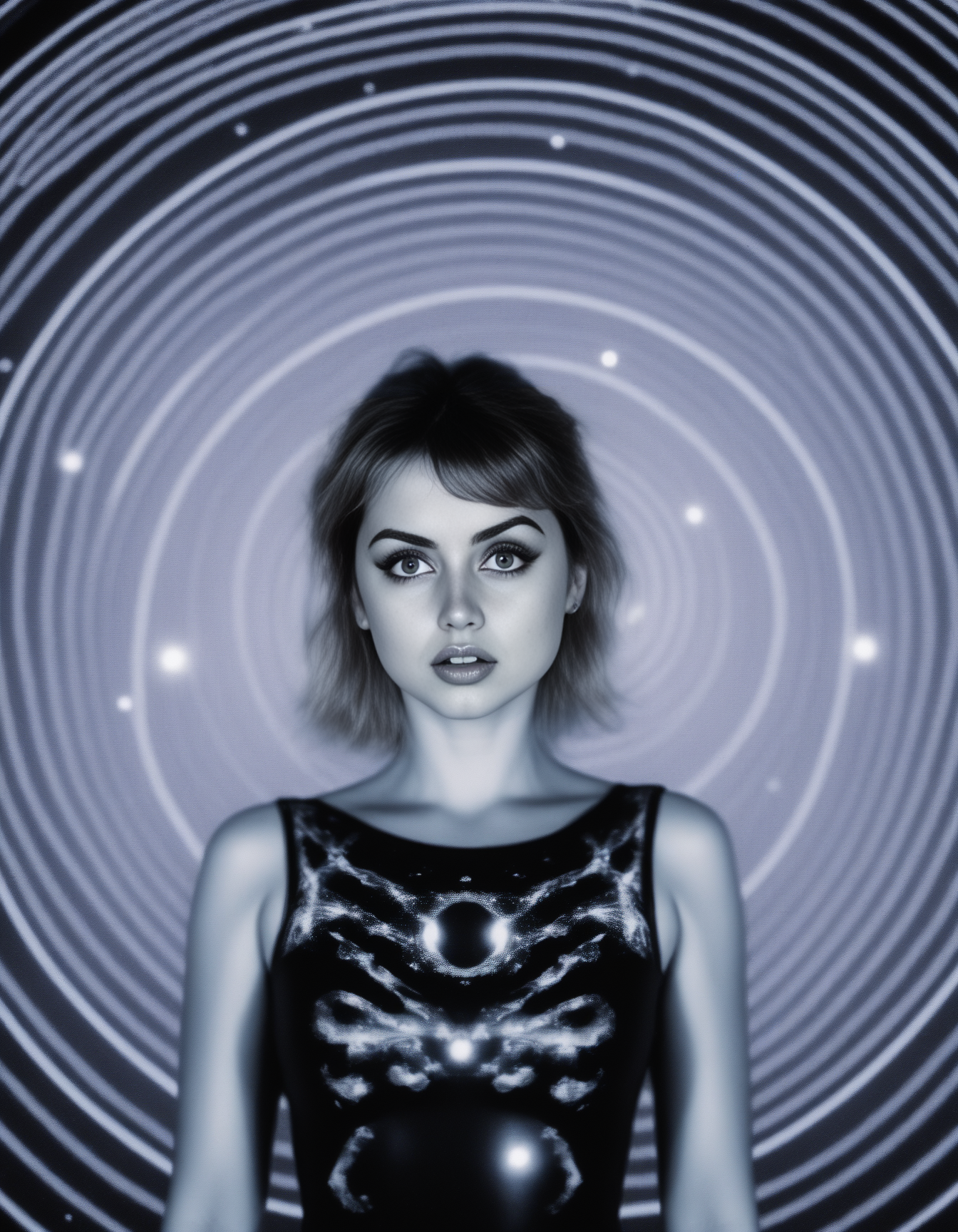 AnadeArmas, art by Brian Bolland, photograph, Stupid curvy Girl surrounded by Interplanetary magnetic field, Bokeh, Screen print, Queercore Art, film grain, Canon R5, telephoto lens, High quality, <lora:AnadeArmasSDXL:1>