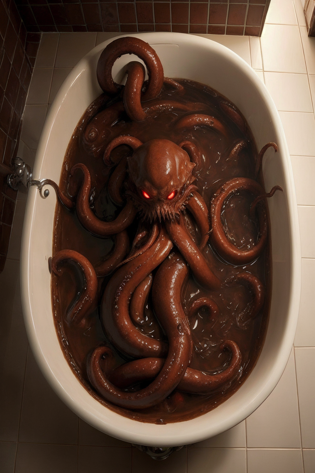 carnagestyle, bathtub, tentacles<lora:CarnageStyle:0.75> (dark_brown:1.3) (masterpiece:1.2), high quality, best quality, high quality, top view