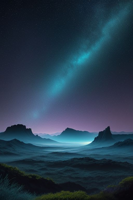 The sky should be a mesmerizing blend of deep blues and soft purples, with a faint, ethereal glow on the horizon. Show a mystical terrain, featuring delicate, bioluminescent flora and fauna that illuminate the landscape with gentle, otherworldly radiance. Let the scene emanate a sense of tranquility, mystery, and a touch of magic.