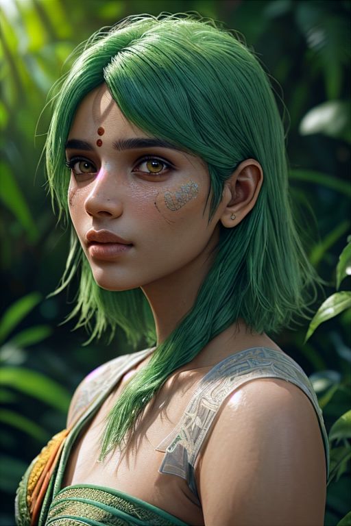 fashion photography portrait of indian girl with green hair, in lush jungle with flowers, 3d render, cgi, symetrical, octane render, 35mm, bokeh, 9:16, (intricate details:1.12), hdr, (intricate details, hyperdetailed:1.15), (natural skin texture, hyperrealism, soft light, sharp:1.2), detailed, sunlight passing through foliage, india