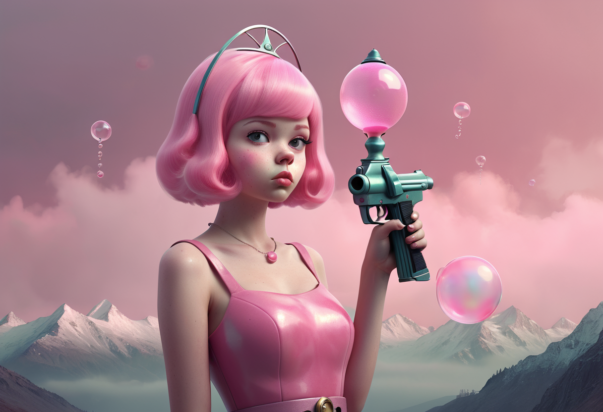 score_9, score_8_up, score_8, score_7_up, score_7,hourglass figure,charming,short hair,,,(((very short hair))),,princess bubblegum, bubblegun,long shot,medium full shot,Misty mountains with a soft hazy sky,style by Caras Ionut