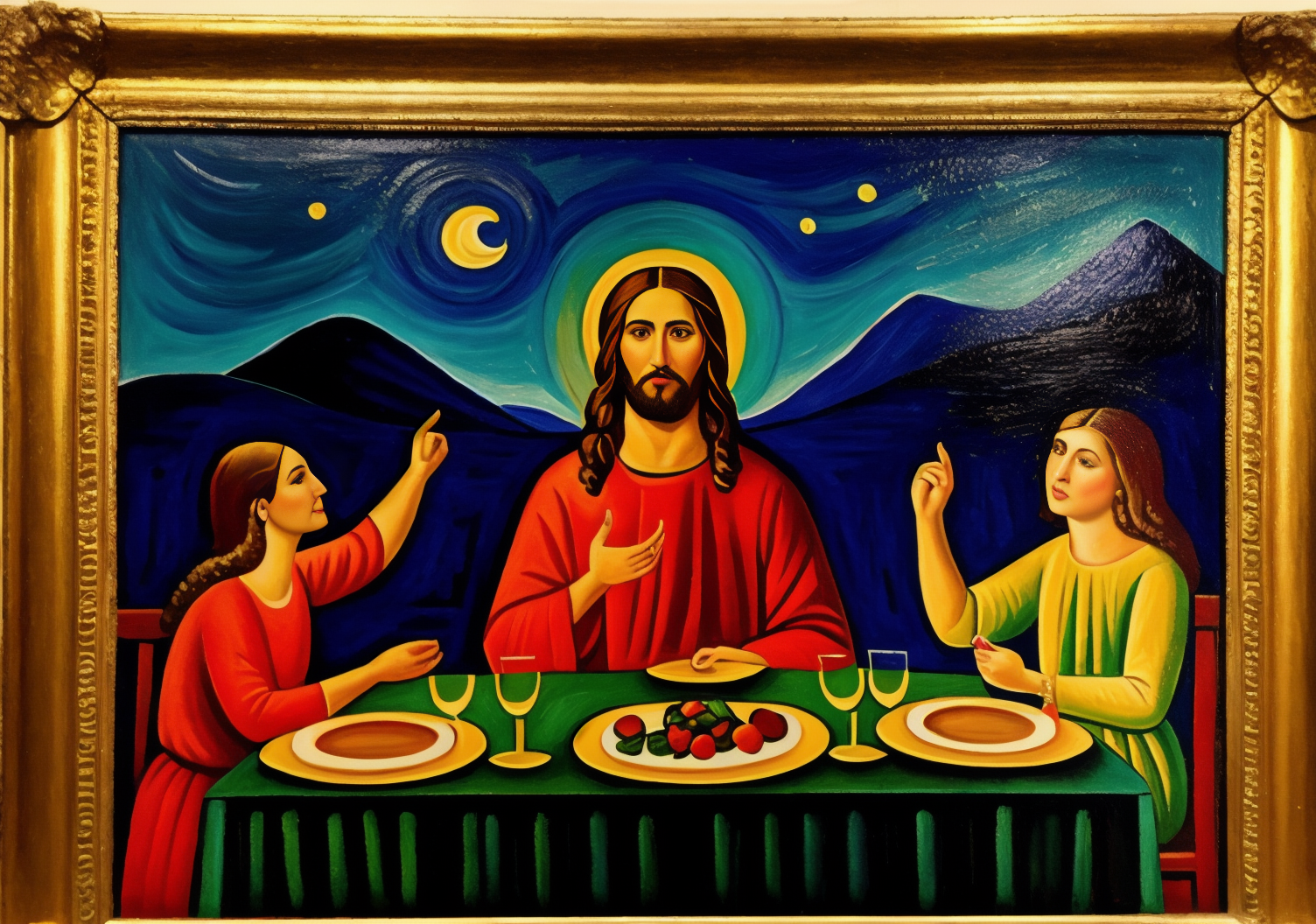 Oil painting, fauvism style, jesus christ pointing up, last dinner, exposition at the museum, golden ornaments around the frame