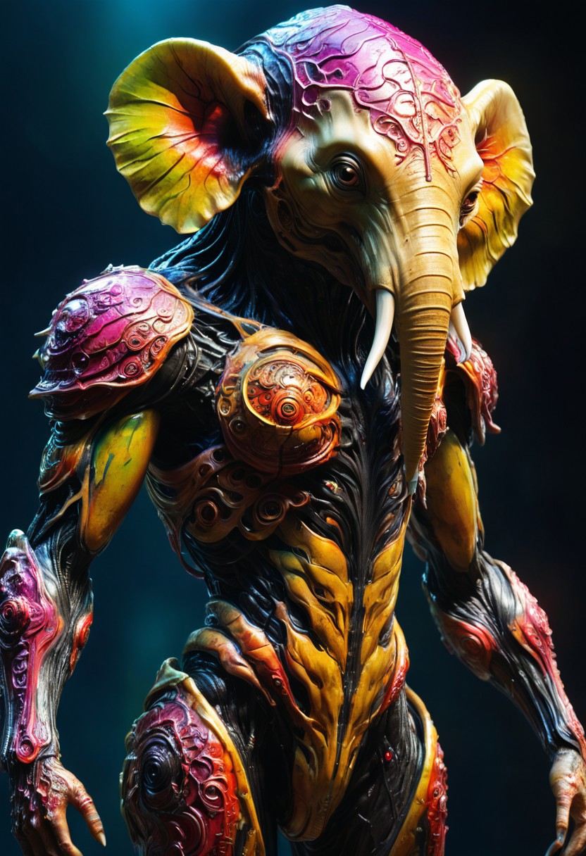 focus on a enlephant non-anthropomorphic bioengineered creature, transparency:1.4, (detailed cybernetic implants fused with organic matter:0.5), full body, (with intensely vibrant swirling colors:1.9), realistic photo, <lora:add-detail-xl:1.0> , <lora:artialien:1> artialien