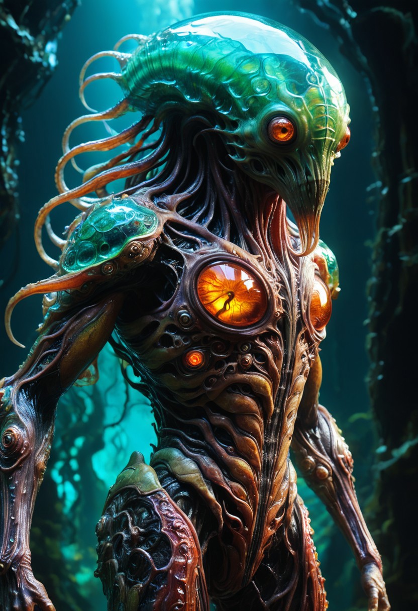 focus on a kraken non-anthropomorphic bioengineered creature, transparency:1.4, (detailed cybernetic implants fused with organic matter:0.5), full body, (with intensely vibrant swirling colors:1.9), realistic photo, <lora:add-detail-xl:1.0> , <lora:artialien:1> artialien