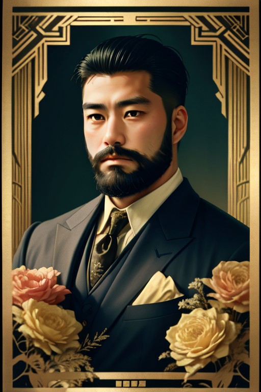 score_9, score_8_up, score_7_up, score_6_up, perfect anatomy, perfect proportions, best quality, masterpiece, high_resolution, high quality, aesthetic, absurdres, (male focus), solo male, A portrait of an Asian man, short hair, undercut, look at viewer, 1920s, Shōwa era, gentleman, suit and tie, (masculine, manly, hunk, macho, ((facial hair, beard))yaro, handsome, charming, alluring), stardom, beautiful, glamorous, art deco, retro, old fashioned, looking at viewer, eye contact, vibrant, vivid, (background of fabric with black&gold&tan art-deco abstract geometric flowers), old technicolor film style, film grain, aged film stock, insanely detailed, masterpiece, extraordinary achievement, award-winning