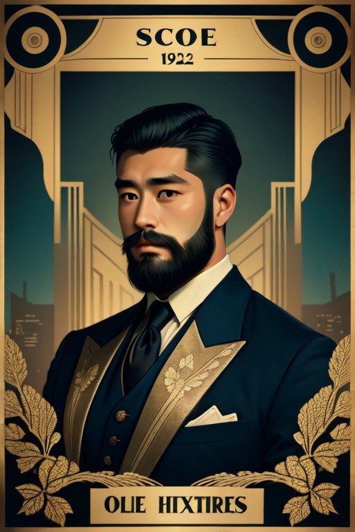 score_9, score_8_up, score_7_up, score_6_up, perfect anatomy, perfect proportions, best quality, masterpiece, high_resolution, high quality, aesthetic, absurdres, (male focus), solo male, A portrait of an Asian man, short hair, undercut, look at viewer, 1920s, Shōwa era, gentleman, suit and tie, (masculine, manly, hunk, macho, ((facial hair, beard))yaro, handsome, charming, alluring), stardom, beautiful, glamorous, art deco, retro, old fashioned, looking at viewer, eye contact, vibrant, vivid, (background of fabric with black&gold&tan art-deco abstract geometric flowers), old technicolor film style, film grain, aged film stock, insanely detailed, masterpiece, extraordinary achievement, award-winning