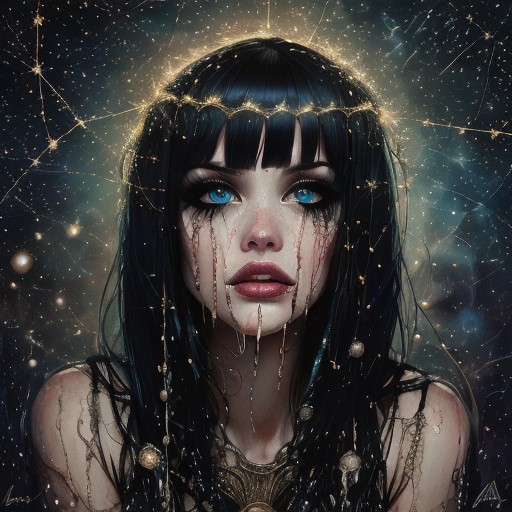 Mature Woman, bangs, black_hair, blue_eyes, constellation, dripping, face, grey_background, light_particles, long_hair, looking_at_viewer, rain, solo, star_\(sky\), teeth, water_drop, wet, <lora:ArsMJStyle4:1>