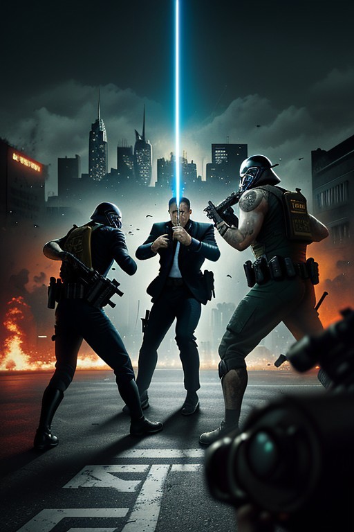 4 men, in gun fight, men in suit, men with guns, extreme gun fight, cinematic, climax, Zack Snyder movie, bright coloring, city background, hollywood, crime fight, pointing at camera, movie poster, machine gun, amazing background, zack Snyder cinematography, crime battle, starwaraa, rebel moon, 300,4k, HDR,
