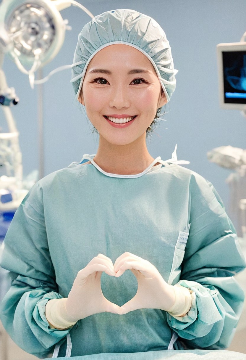 (cowboy shot:1.2), smiling elegant slim asian woman, Japanese, wearing surgical_mask_open, completely_undone, (((surgical outfit))), black hair, (heart hands, wide smile), (modern surgery room), photo, 1girl, ultra high res, realistic photorealistic, ultra-detailed, finely detailed, high resolution, perfect dynamic composition, (perfect eyes), (detailed eyes), solid circle eyes, sparkling eyes, (clean eyes), anatomically correct, super detail, textured skin, extremely detailed face and eyes, detailed facial features, ((perfect face)), wide hips