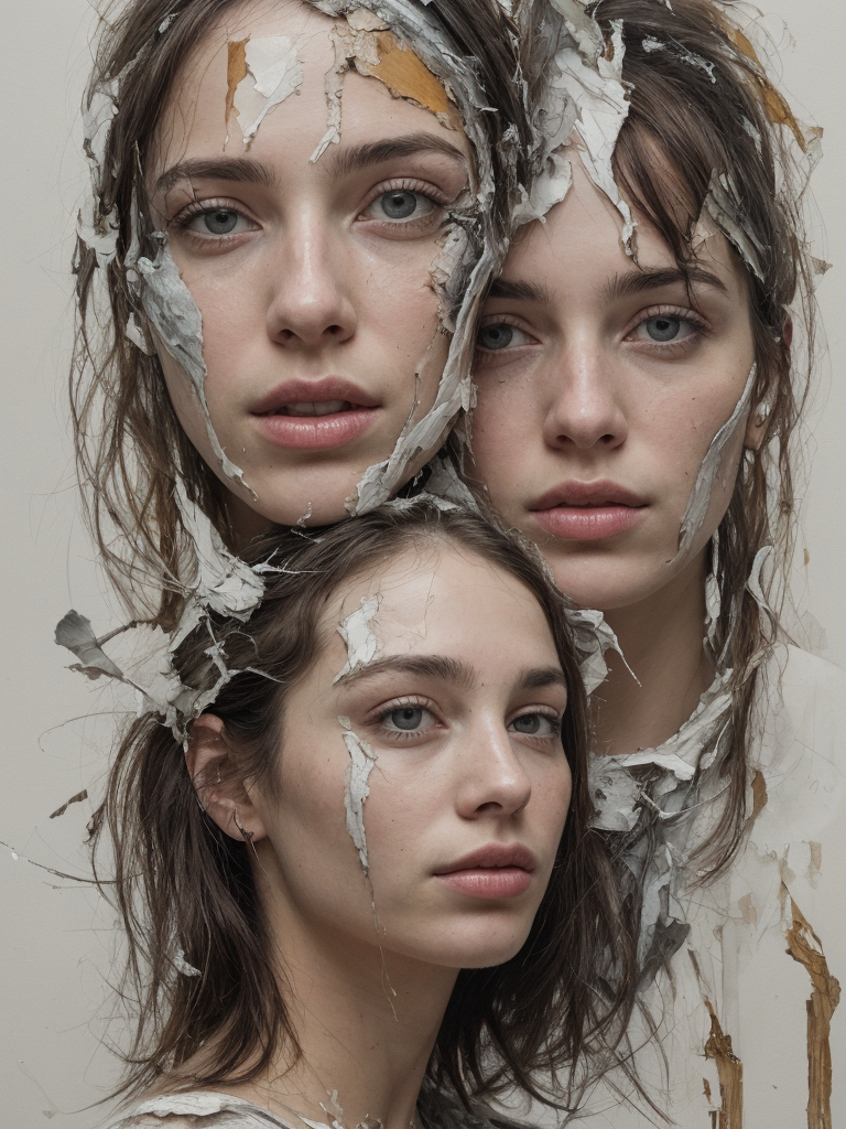a painting, by Carol Bove, beautiful gemini twins portrait, torn, half - electric striking woman, jeremy cowart, lacking in three-dimensionality, deteriorated, spiraling, dissolution