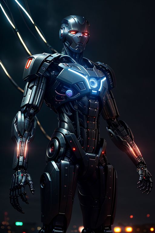 a giant chromed robot with bright tubes and wires in its body BREAK destroying a city at night time during a thunder storm BREAK SXBT, american shot, ultra realistic, deep shadows, spot lights, dutch angle, dolly zoom, sharp focus