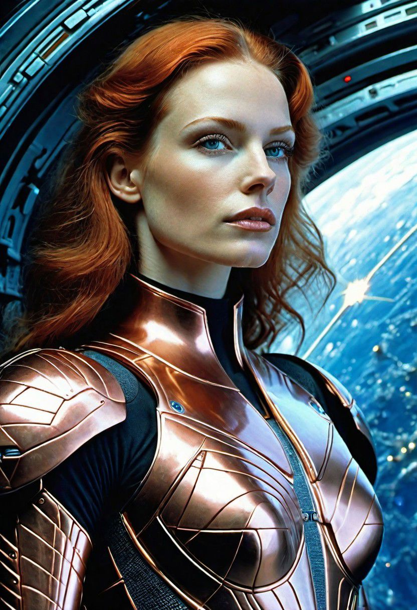 a professional closeup photo of olmn <lora:OliviaMunnV2Dogu:1> futuristic shiny armor with copper trim, , (small breasts:1.2), skindentation, spaceship window, stars, (by Alejandro Burdisio:1.2), (by Michael Whelan:1.2),(by Artist Philippe Druillet:1.3),(Kodak Ektar:1.2)