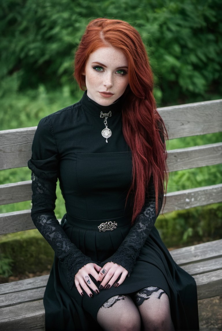 Gothic style Instagram, full shot, slim, 18 year old redhead goth woman on a parkbench, black clothes, freckles, tattoos, little smile, detailed skin face and eyes, natural lighting, skinny, film grain, low contrast, natural face, long messy red hair, green eyes, high definition, highest resolution, UHD, centered body, <lora:add_detail:1> . Dark, mysterious, haunting, dramatic, ornate, detailed