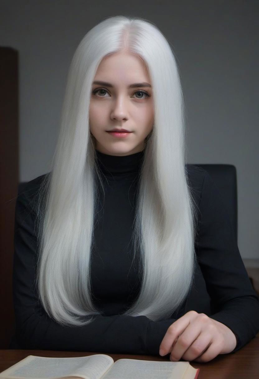 image description for beautiful girl with white hair in front of a desk, 1girl, solo, long hair, looking at viewer, book, head rest, desk, book stack, long sleeves, black shirt, white hair, epiCPhoto