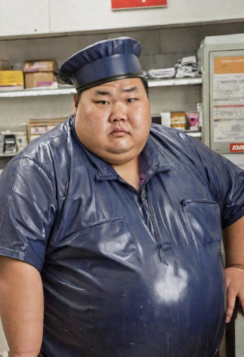 an extremely obese asian man in a mail couriers uniform made of rubber standing behind the counter of a post office